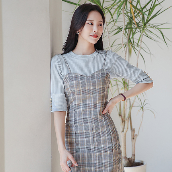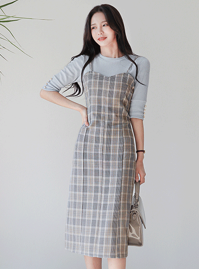 摩登 格子 吊带 开衩 长款连衣裙