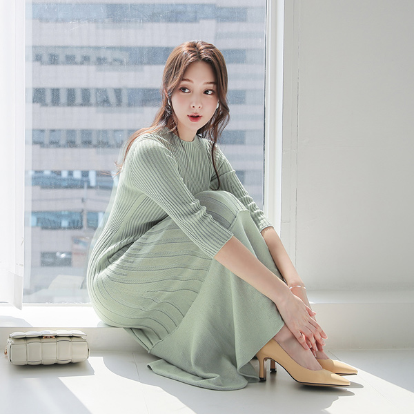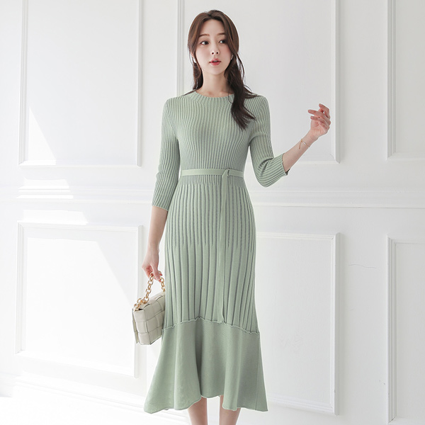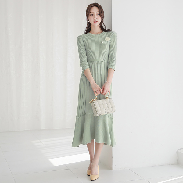 Whole Garment 条绒 喇叭 环扣腰带 针织衫 连衣裙