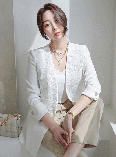 时尚 蕾丝 花边 金色纽扣 无领 夹克