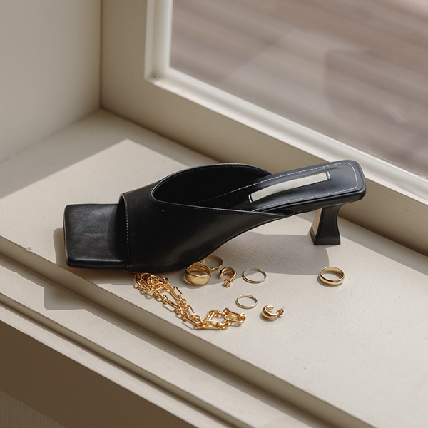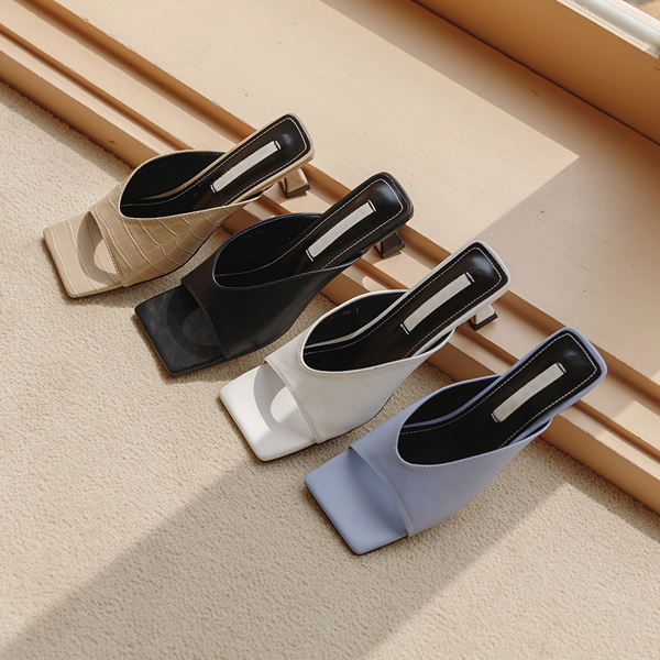 深v领 饰边 方形 中跟 拖鞋