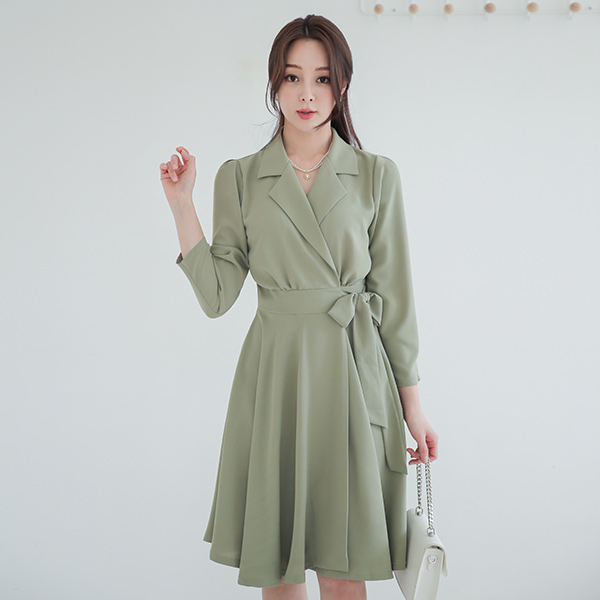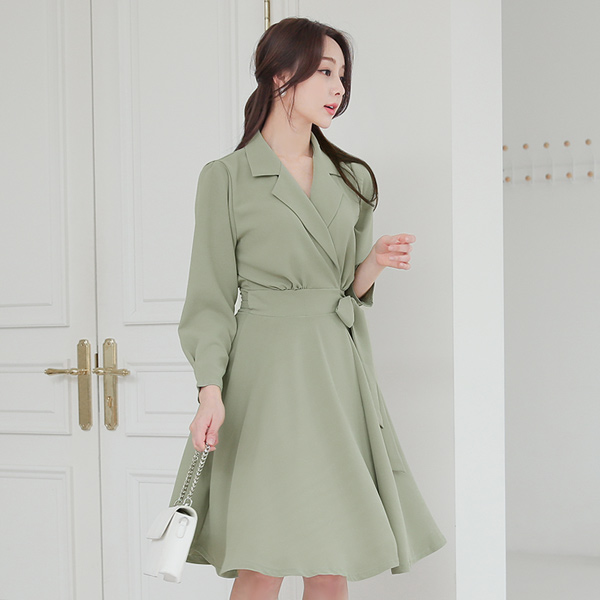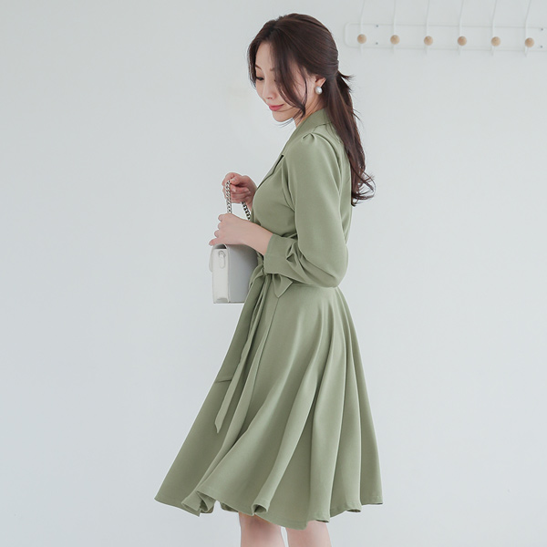 裹身衣领 褶皱 束带 喇叭 连衣裙