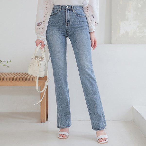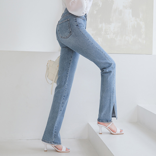 时尚 侧纽 开衩 一字型 牛仔色 裤子