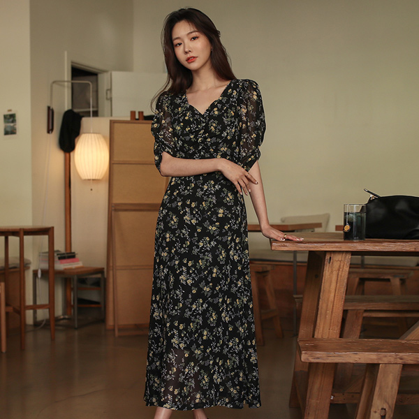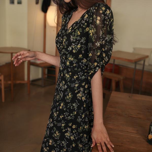 复古 碎花 花纹 褶皱 喇叭 连衣裙