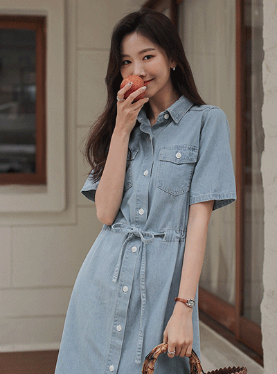 双口袋 抽绳 灯光 썬 牛仔色 连衣裙