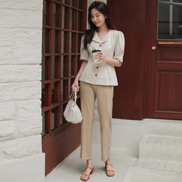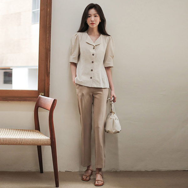 亚麻 泡泡袖 V字领 罩衫