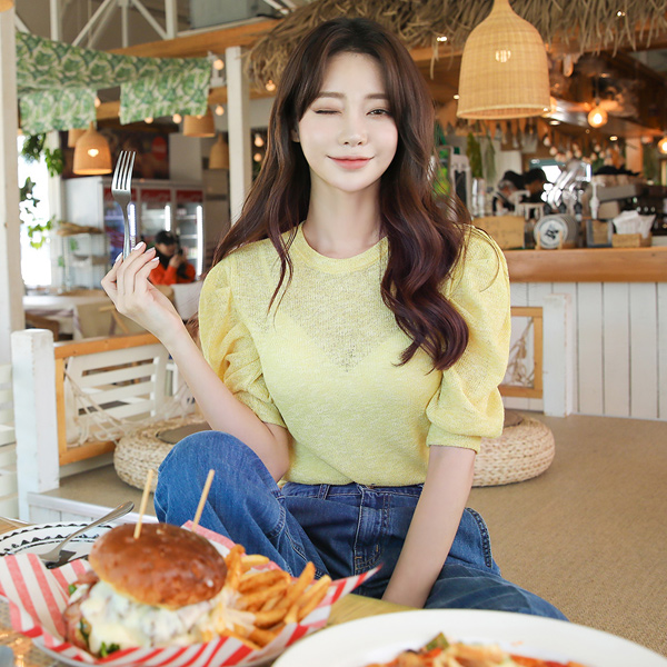 夏天 亚麻 褶皱 泡泡袖 针织t恤