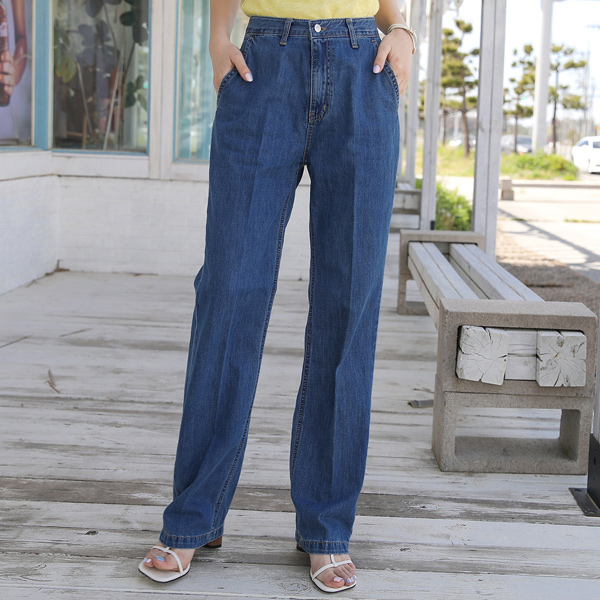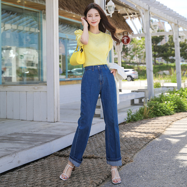 点缀 去皱纹 柔丝 宽松 长款 牛仔色 裤子