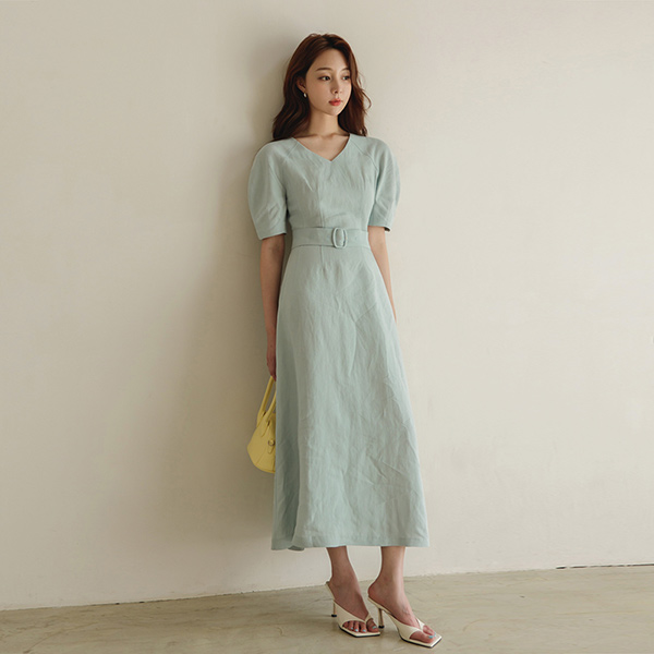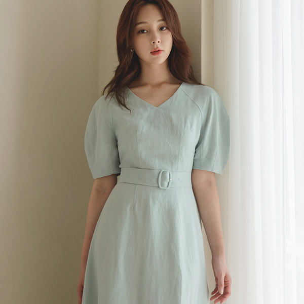 V字领 泡泡袖 束带 A 线条 连衣裙