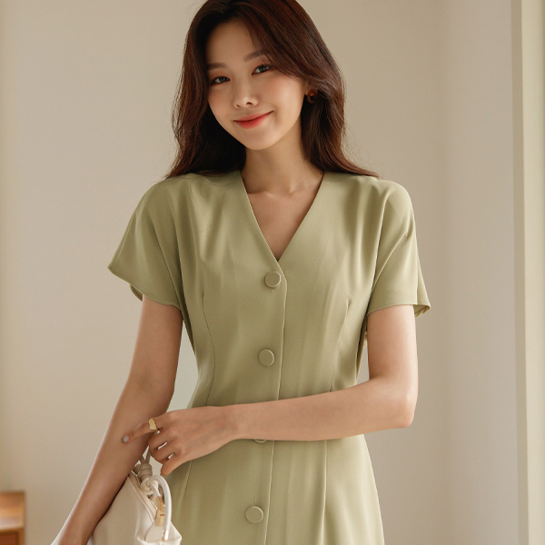 女性化的 V字领 插肩 扣子 连衣裙