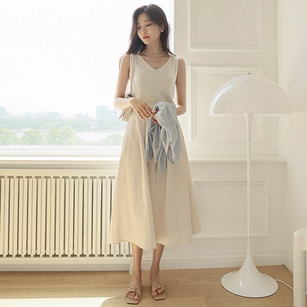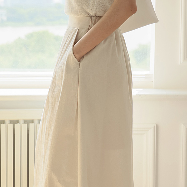 双口袋 喇叭 后侧松紧带 长款 裙子