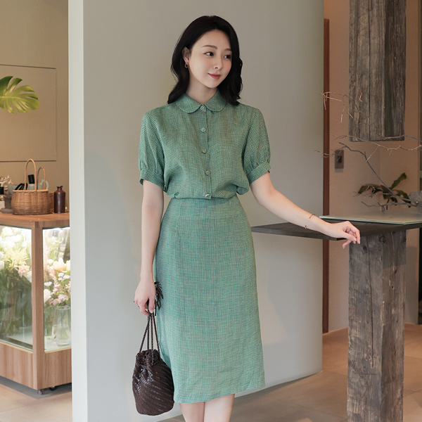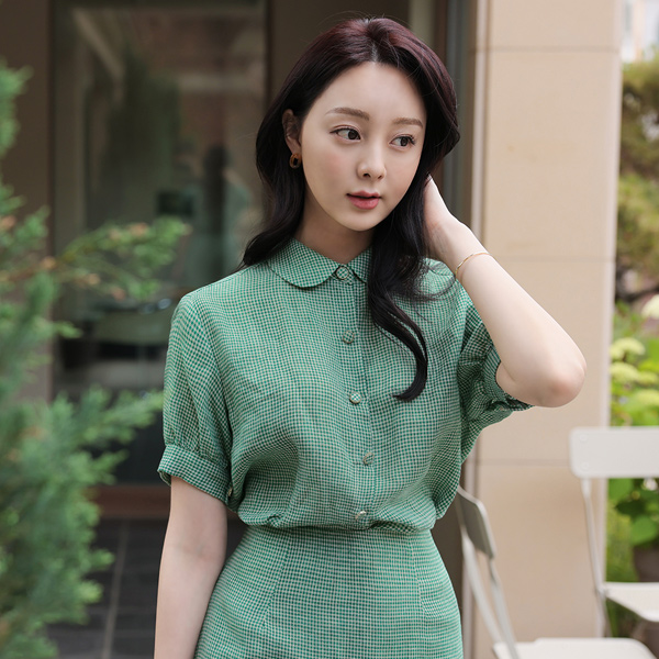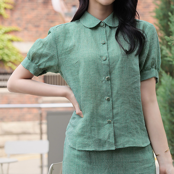 亚麻 原纱混搭 格子 平领 泡泡袖 罩衫
