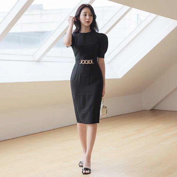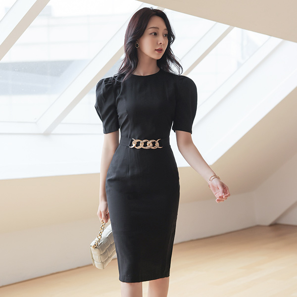 豪华 粗 黄金链条 泡泡袖 连衣裙