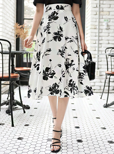 墨水 花纹 丝滑 后侧松紧带 喇叭 裙子