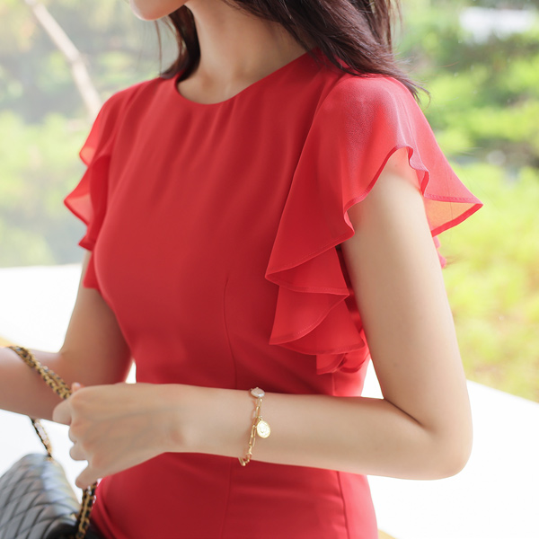 雪纺 褶裥 袖子 黄金 带扣 连衣裙