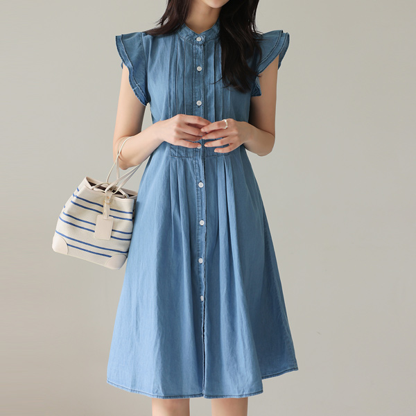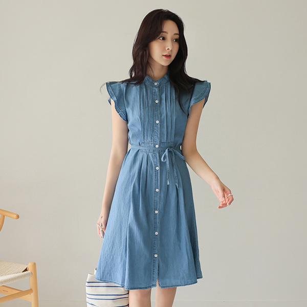 褶裥 袖子 细褶 牛仔色 连衣裙