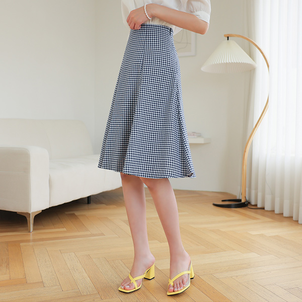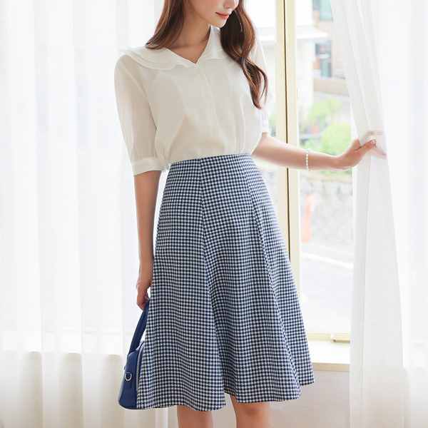 棉 黑白 格子 三角襟 喇叭 裙子