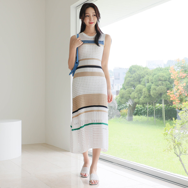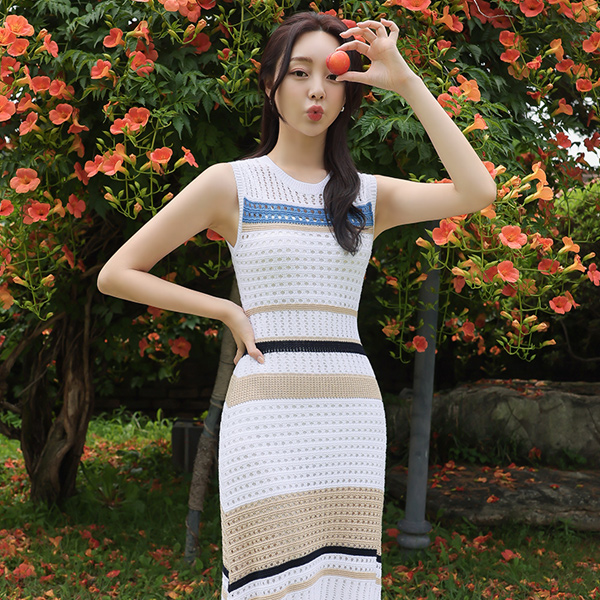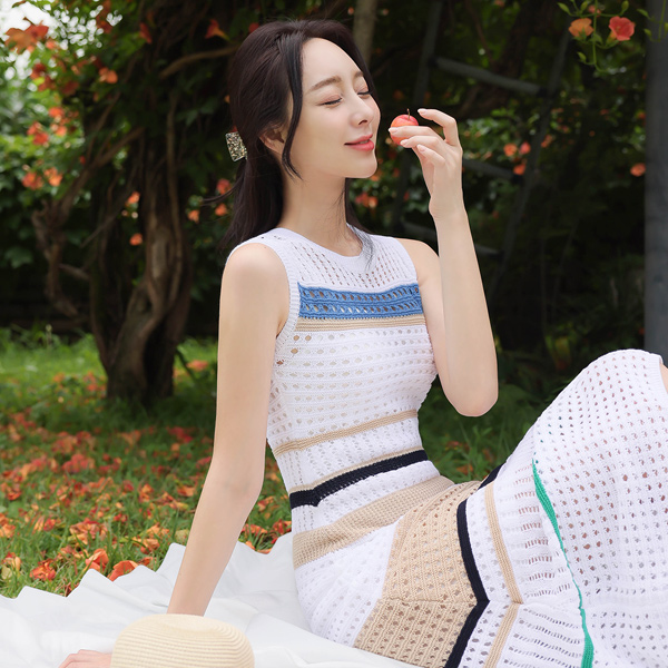 网状 印花 配色 无袖 针织衫 长款连衣裙