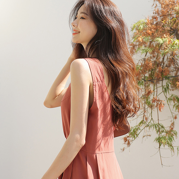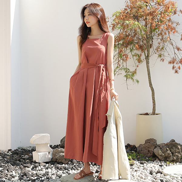 亚麻 方领 裹身风格 长款连衣裙