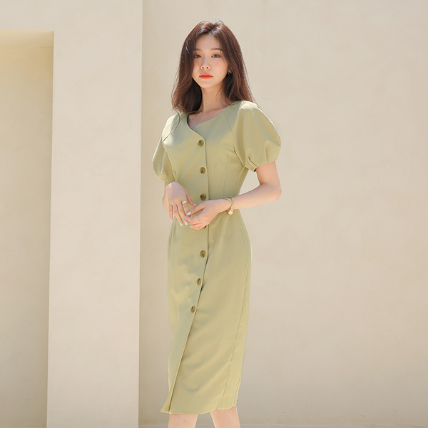 N 侧纽 扣子 泡泡袖 连衣裙