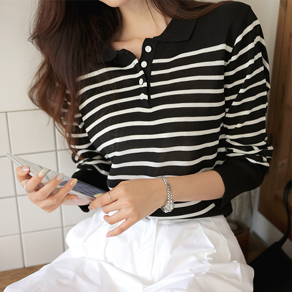 日常 休闲的 条纹 领子 针织衫