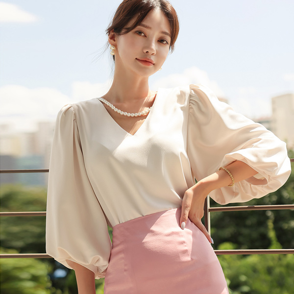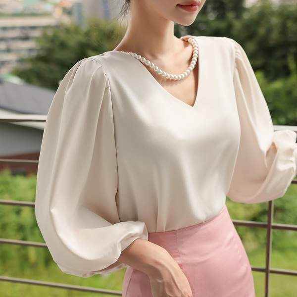 珍珠 项链 泡泡袖 袖 丝滑 罩衫
