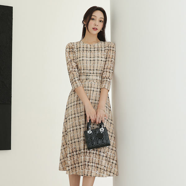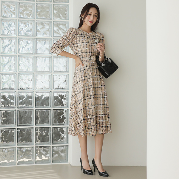 天然 格子 蕾丝 束带 喇叭 连衣裙