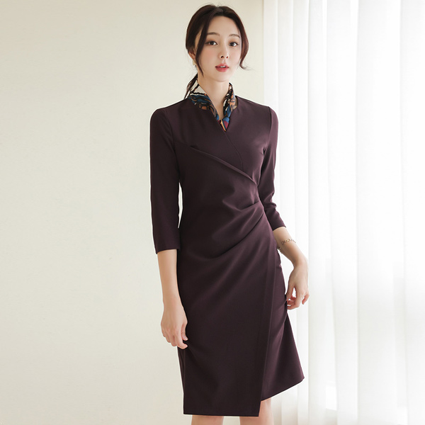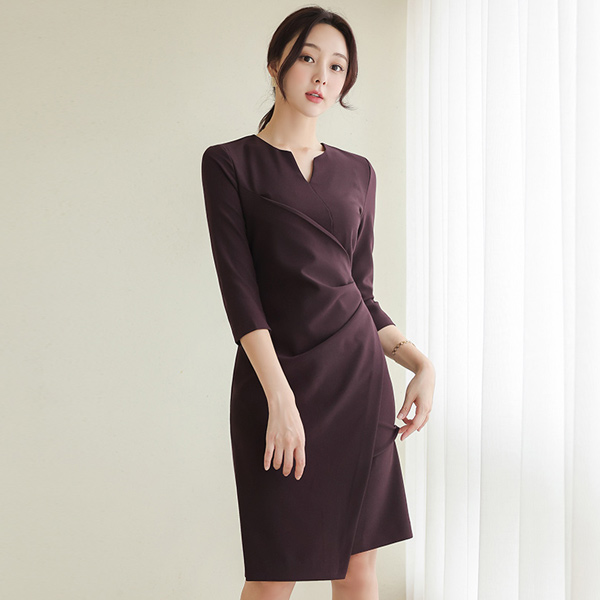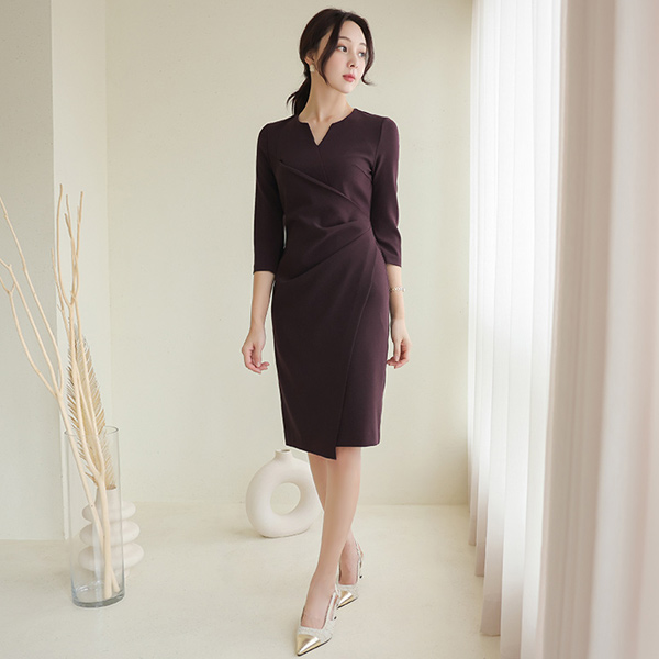 不规则 褶皱 v 开衩领 弹力 连衣裙