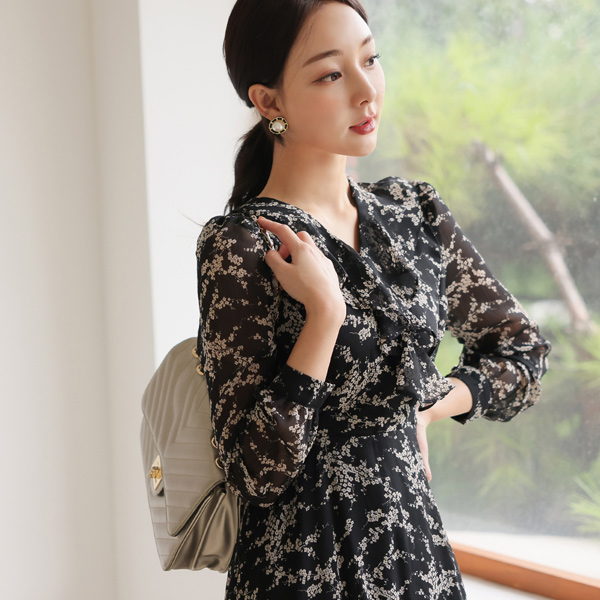 荷叶边 褶皱装饰 花纹 雪纺 连衣裙