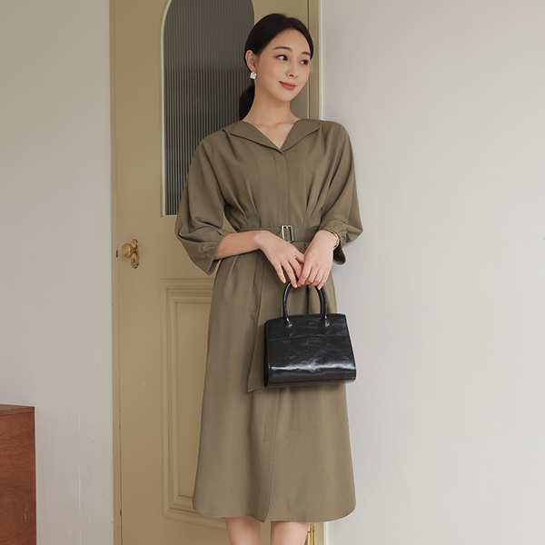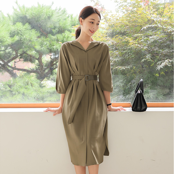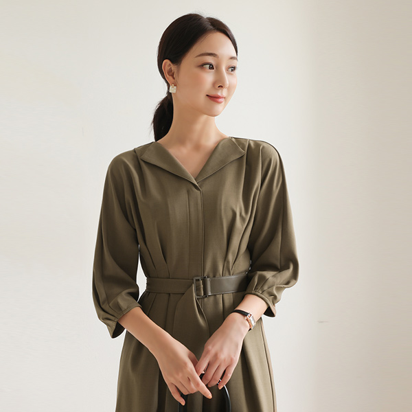 翼领 细褶 开叉线条 弹力 连衣裙