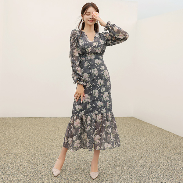 朦胧 花纹 褶皱 褶裥 雪纺 连衣裙