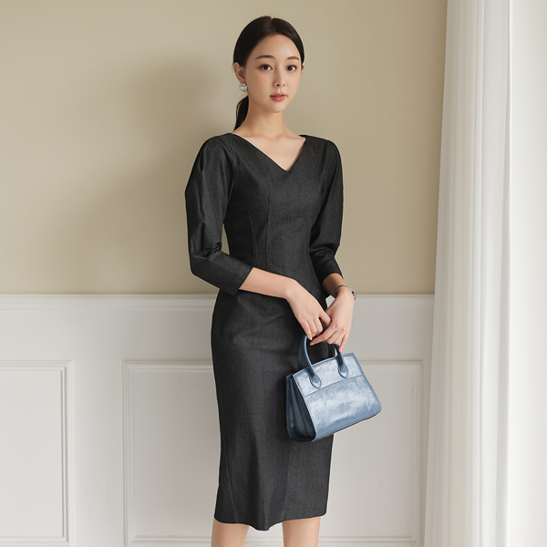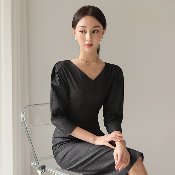 双V领 细褶 泡泡袖 连衣裙