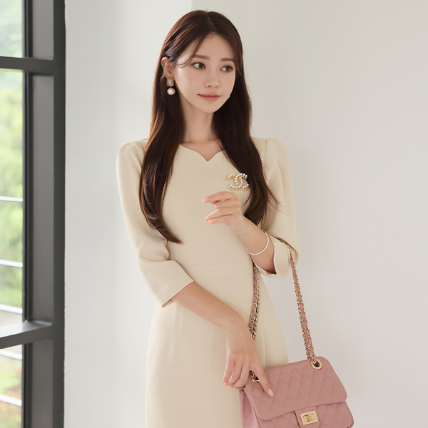 ELLE 郁金香型 心形领 中长连衣裙