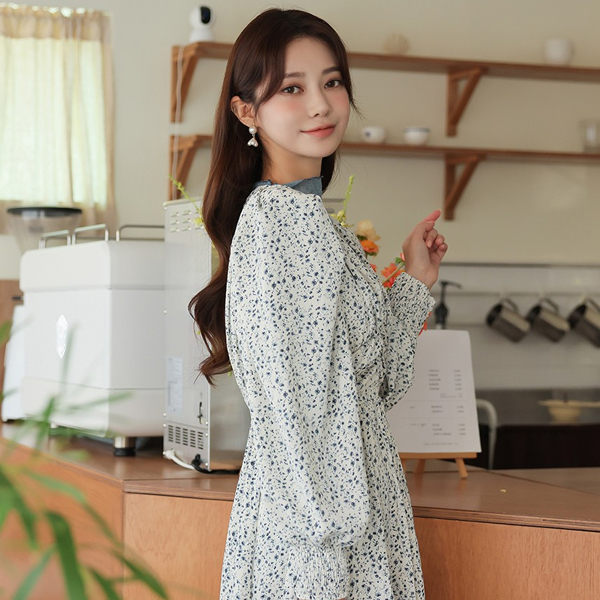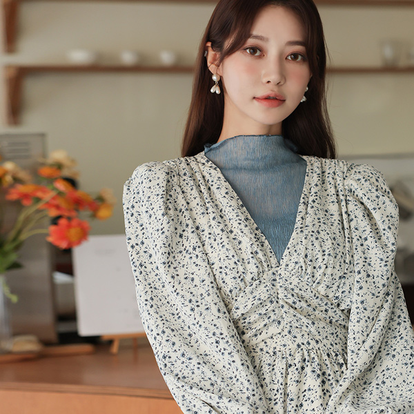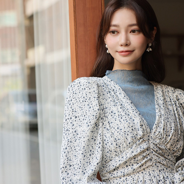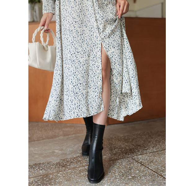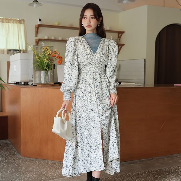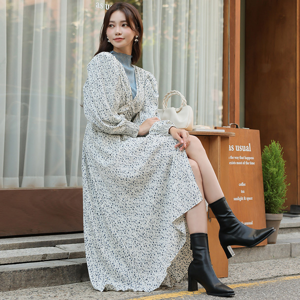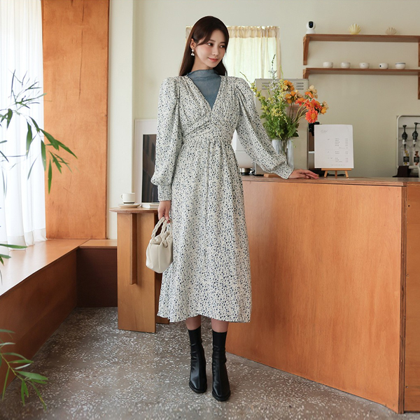 ODE 曲线 泡泡肩 褶皱 长款连衣裙