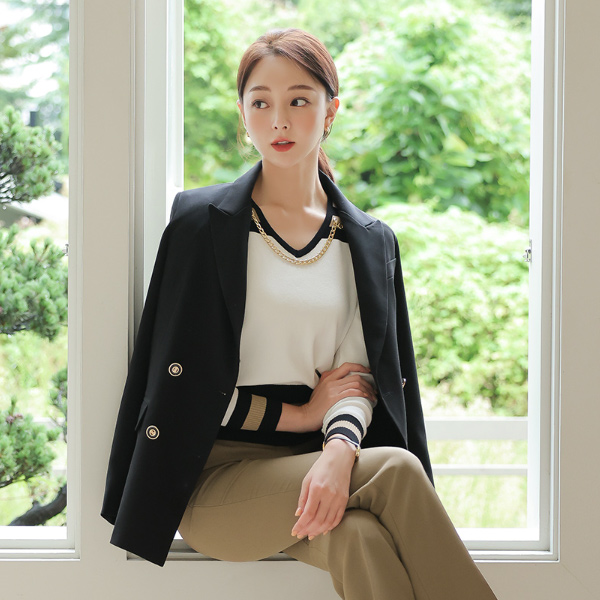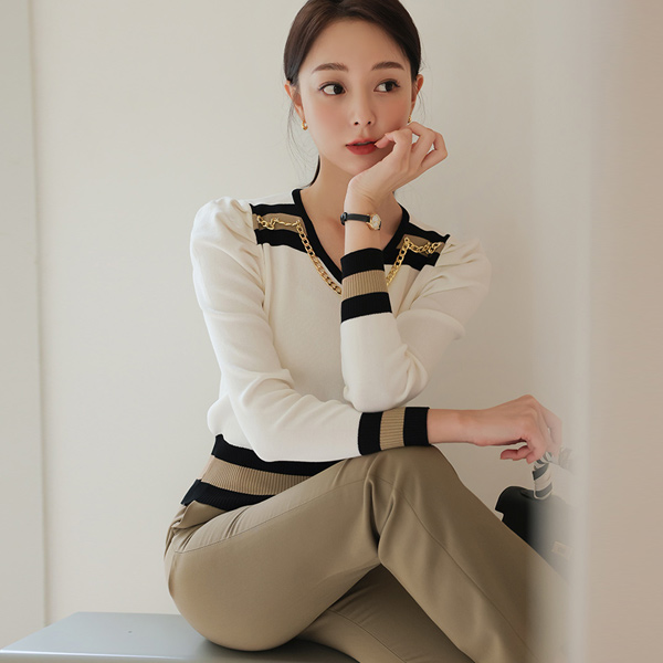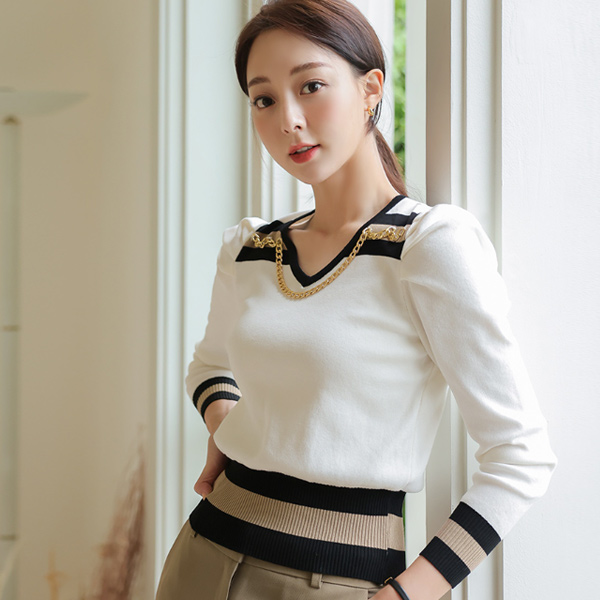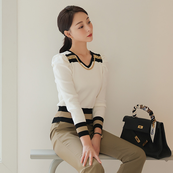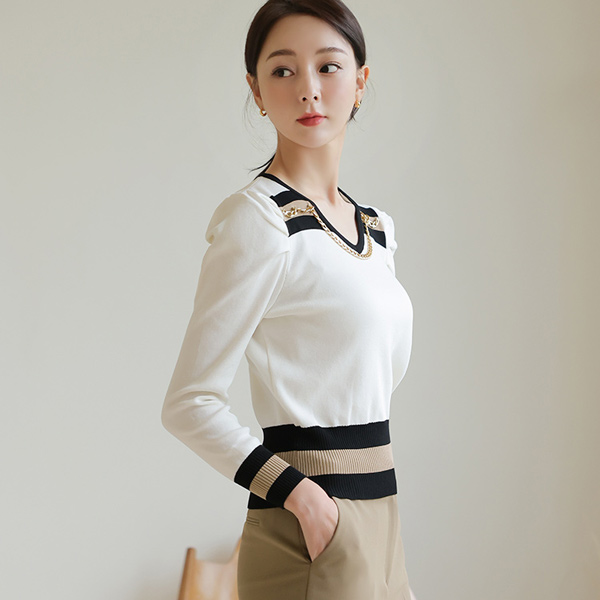 黄金链条 配色 细褶 泡泡袖 袖 针织t恤