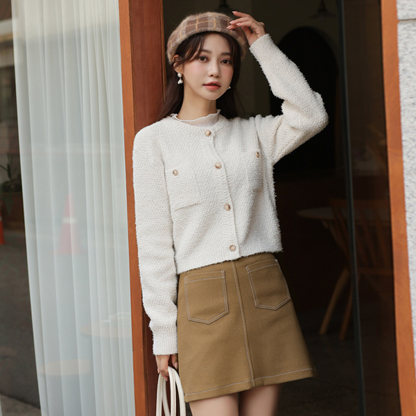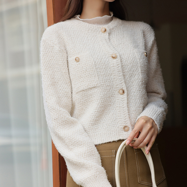 金色纽扣 口袋 流苏 粗呢 针织开衫