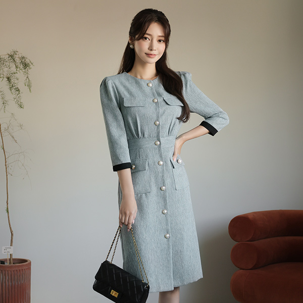 渲染 粗呢 珍珠扣 口袋 连衣裙