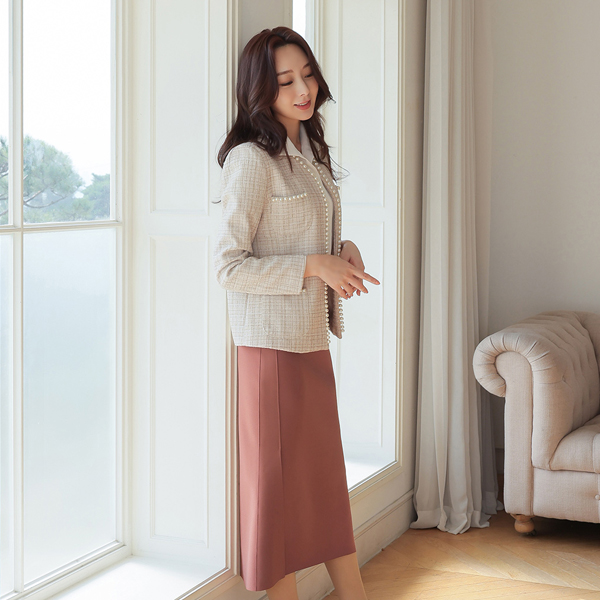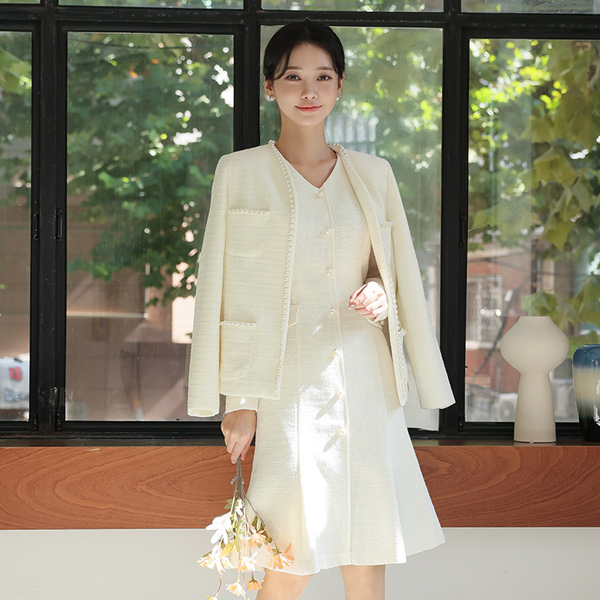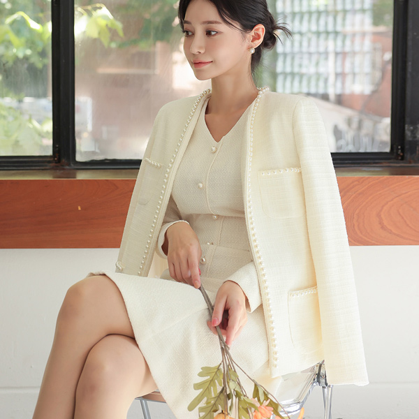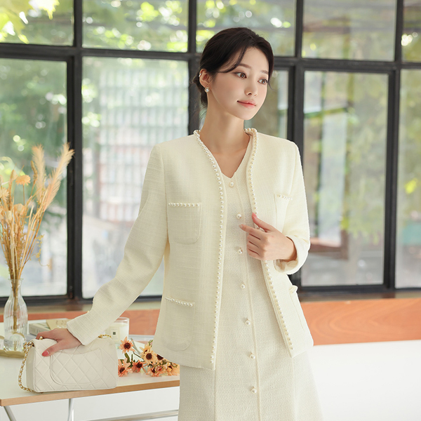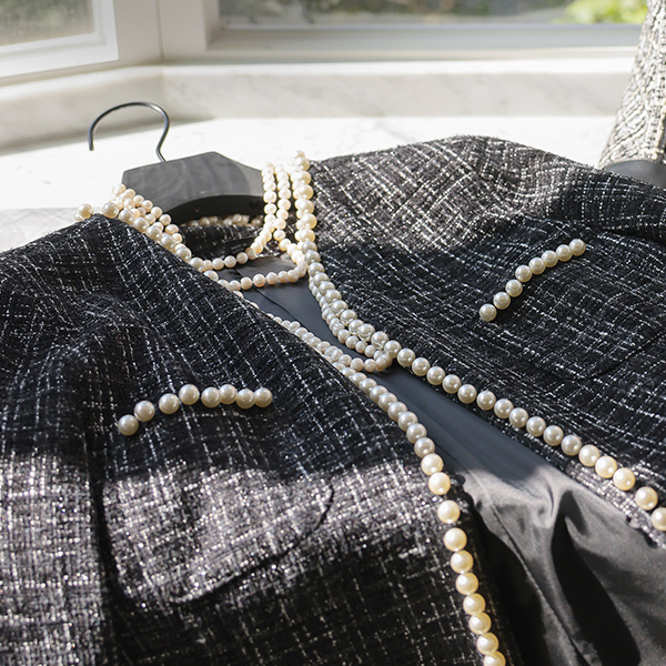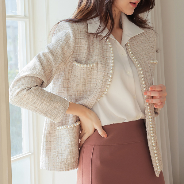 ELLE 珍珠 花边 口袋 粗呢 夹克