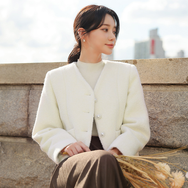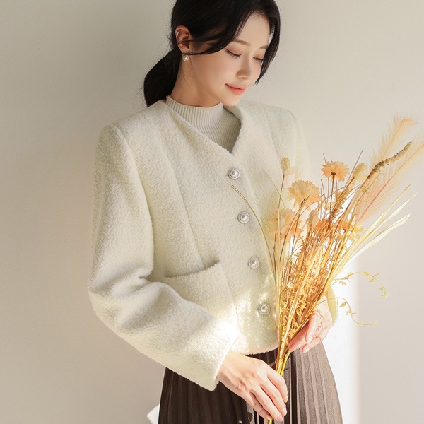 Creamy 结子花式羊毛 珍珠扣 无领 短夹克