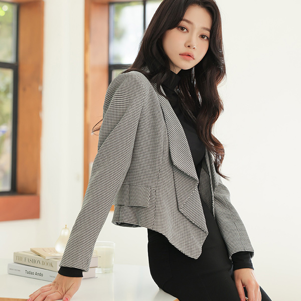 犬牙格子花纹 褶裥 披巾领 敞开式 短夹克