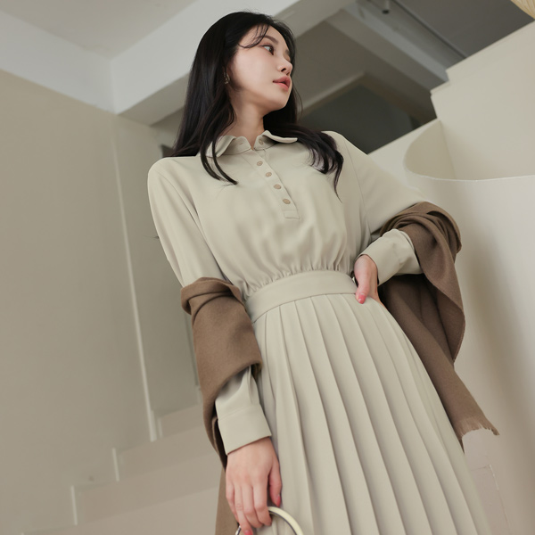 衬衫 领子 后侧松紧带 褶边 长款连衣裙