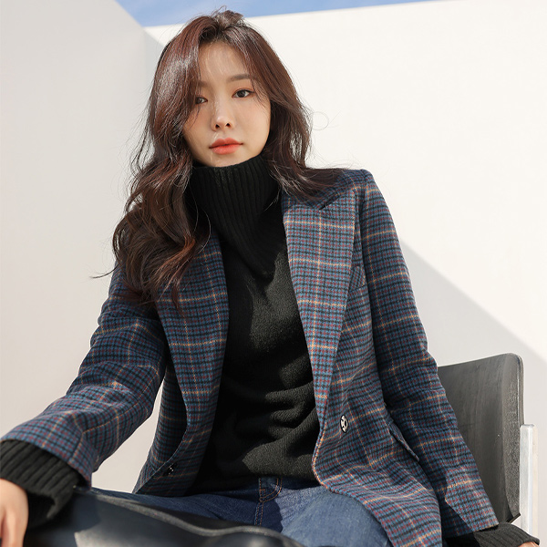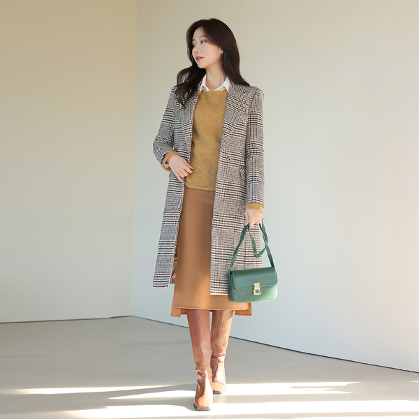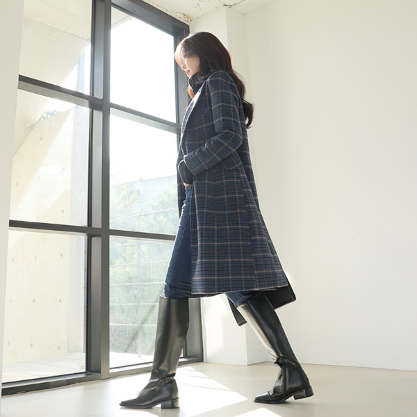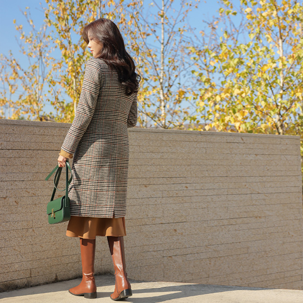 古典 格子图案 天然 宽松 束带 羊毛 大衣