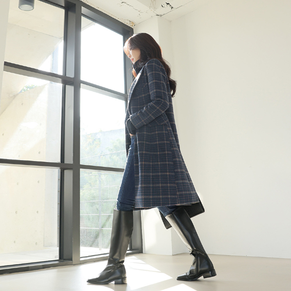 古典 格子图案 天然 宽松 束带 羊毛 大衣