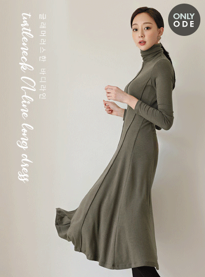 细褶 开叉线条 高翻领 A字型 长款连衣裙
