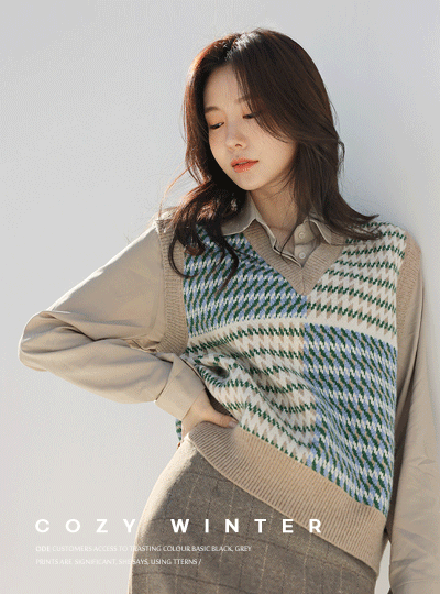 配色图案 分层 V字领 针织衫 马甲
