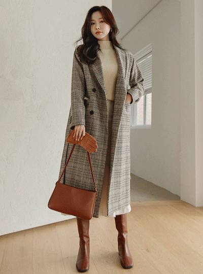 古典 犬牙 格子 束带 羊毛 长款大衣(绗缝里料)