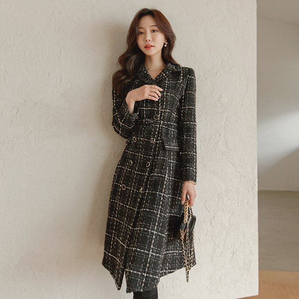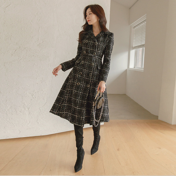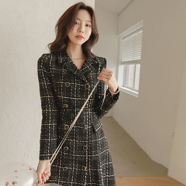 Holiday 双排扣 束带 珍珠粗花呢 连衣裙