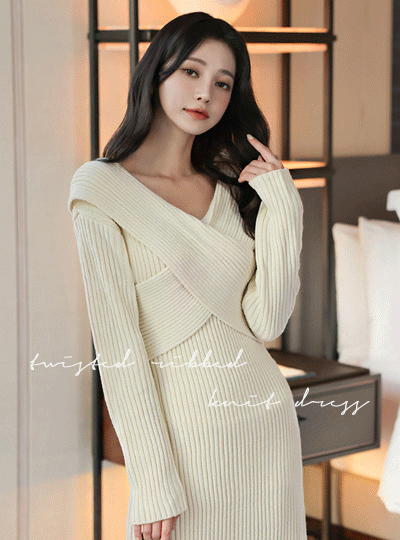 X尺 扭曲 双V领 条绒 针织衫 连衣裙