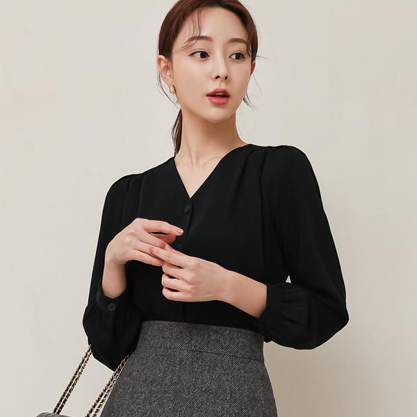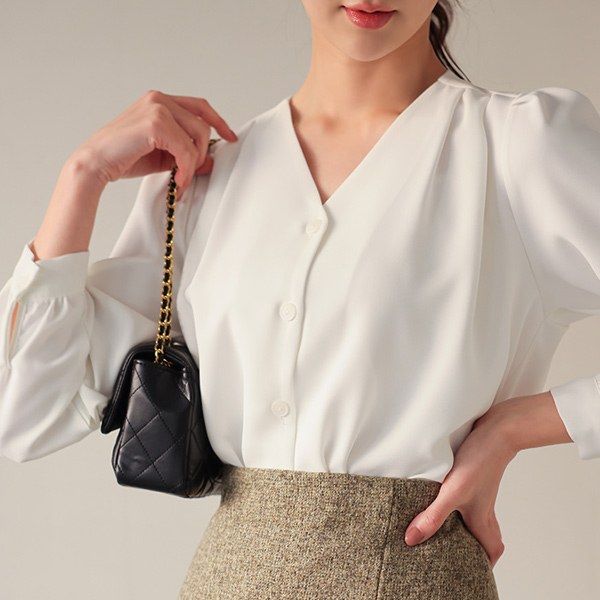 V字领 细褶 扣子 罩衫