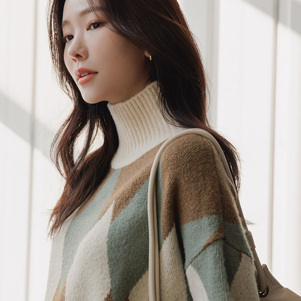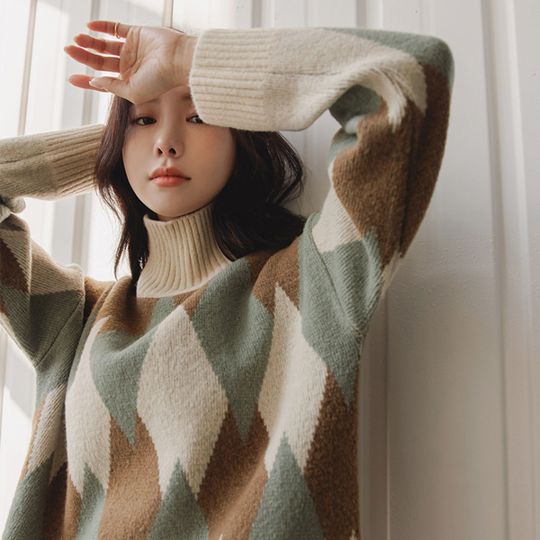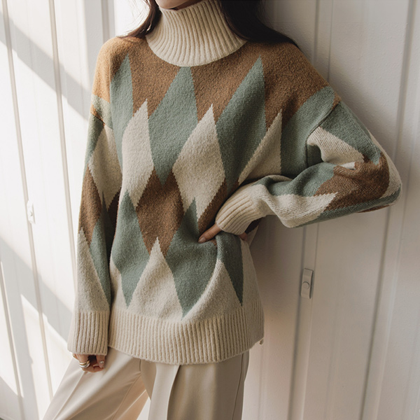 菱形花纹 图案 高领 宽松 针织衫