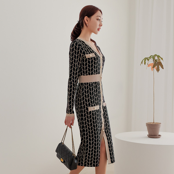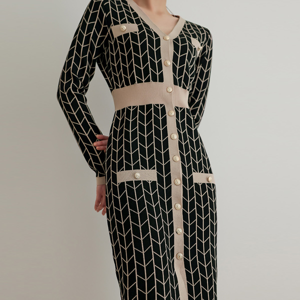 V格子 金色 针织衫 连衣裙